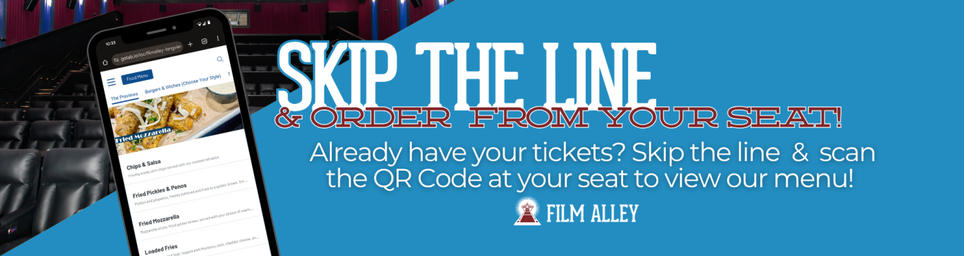 Already have your tickets? Skip the Line and Order from your seat with GoTab. Just scan the QR code at your seat to see our full dining menu and have your items delivered straight to your seat!